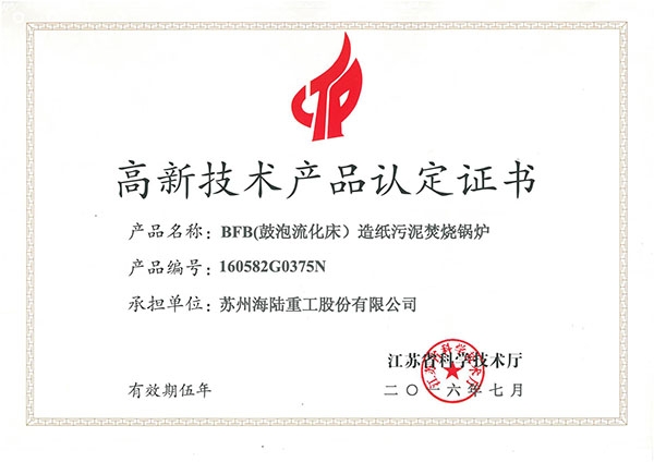 近日,公司收到江蘇省科學技術廳頒發的高新技術產品認定證書, 我公司的研制BFB(鼓泡流化床)造紙污泥焚燒鍋爐獲省高新技術產品認定。該產品主要用于造紙廠處理污泥工藝流程中,將造紙污泥干化后摻煤燃燒,解決污泥廢物處置問題,同時對污泥焚燒過程產生的熱量進行回收,產生次高壓蒸汽用于發電或造紙工藝循環利用,實現了環境污染治理與資源循環利用并舉。